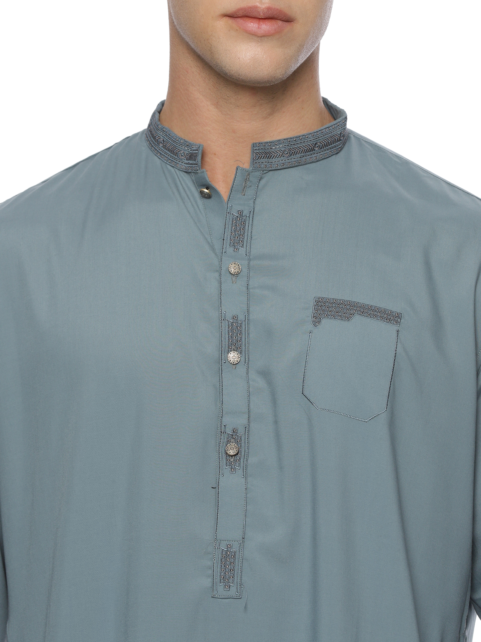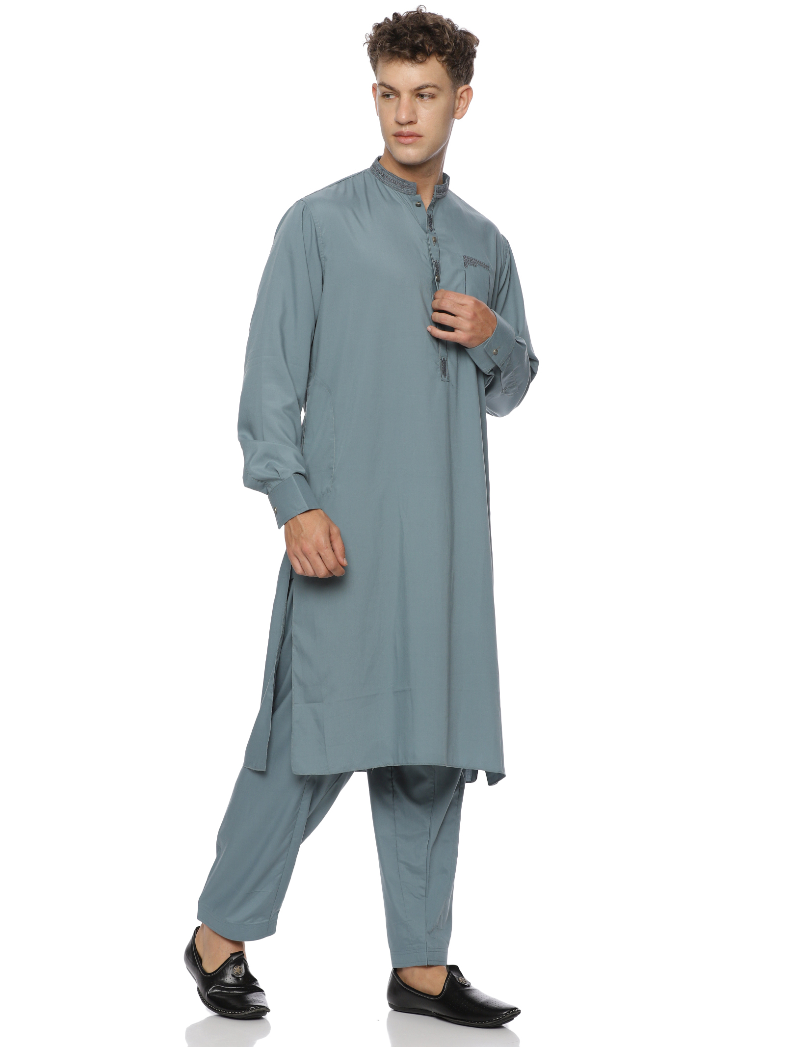 Designed for a sharper, more structured appearance, this green formal kurta trousers set offers a modern fit with clean lines. The kurta features subtle detailing, while the straight-cut trousers ensure a neat silhouette. Perfect for events, workdays, or weekend wear.